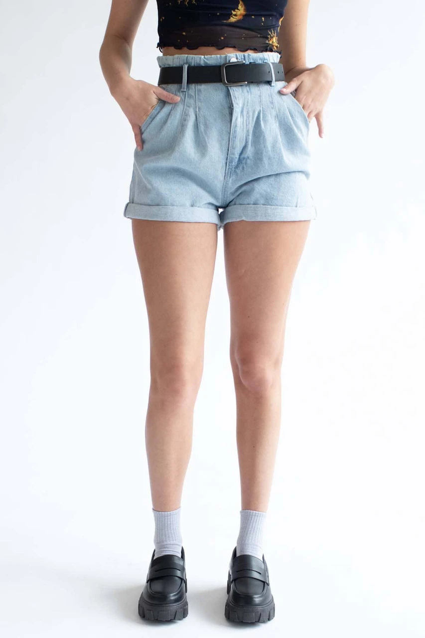 Light Wash High Waisted Pleated Denim Shorts