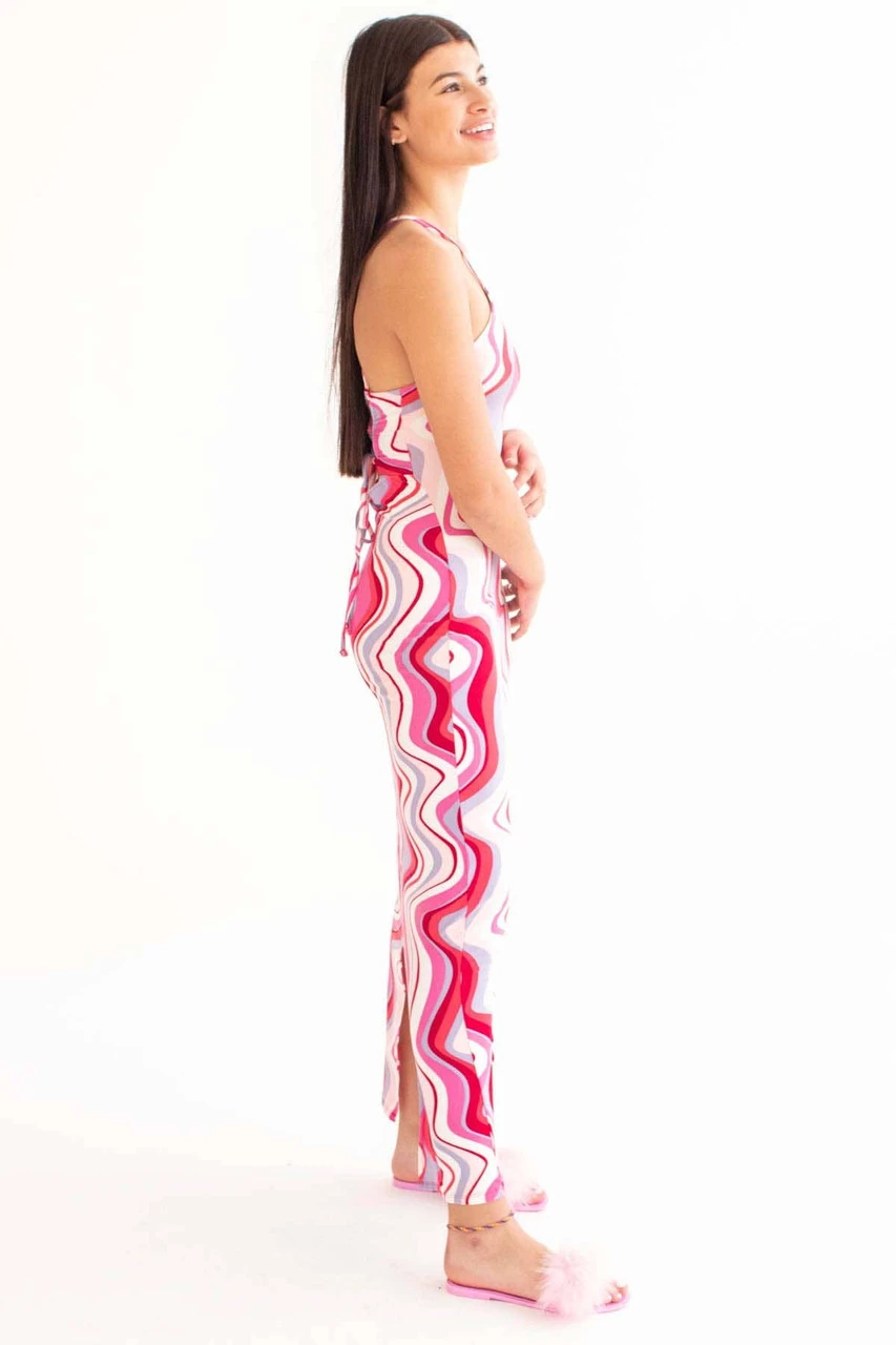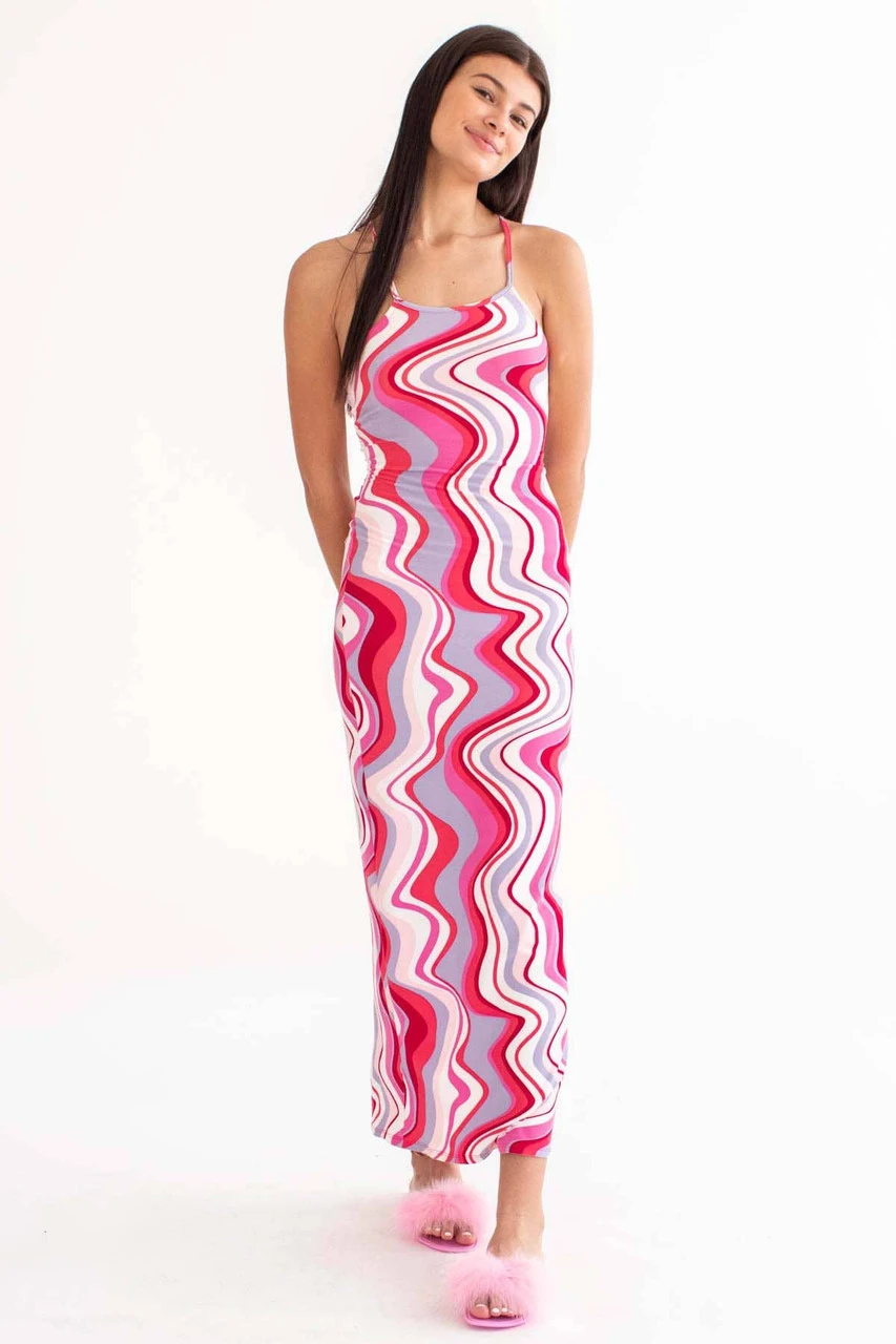 Red Marbled Waves Lace Up Back Maxi Dress